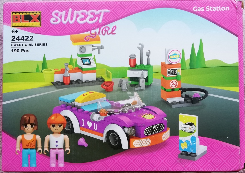 На выходных дедушка снова решил устроить своим двум пятилетним непоседам «строительный марафон». В этот раз в ход пошёл яркий набор BLX-24422, где есть всё: и мини-заправка, и инструментальный стол, и разноцветная фиолетово-оранжевая машинка, и даже пара минифигурок.
